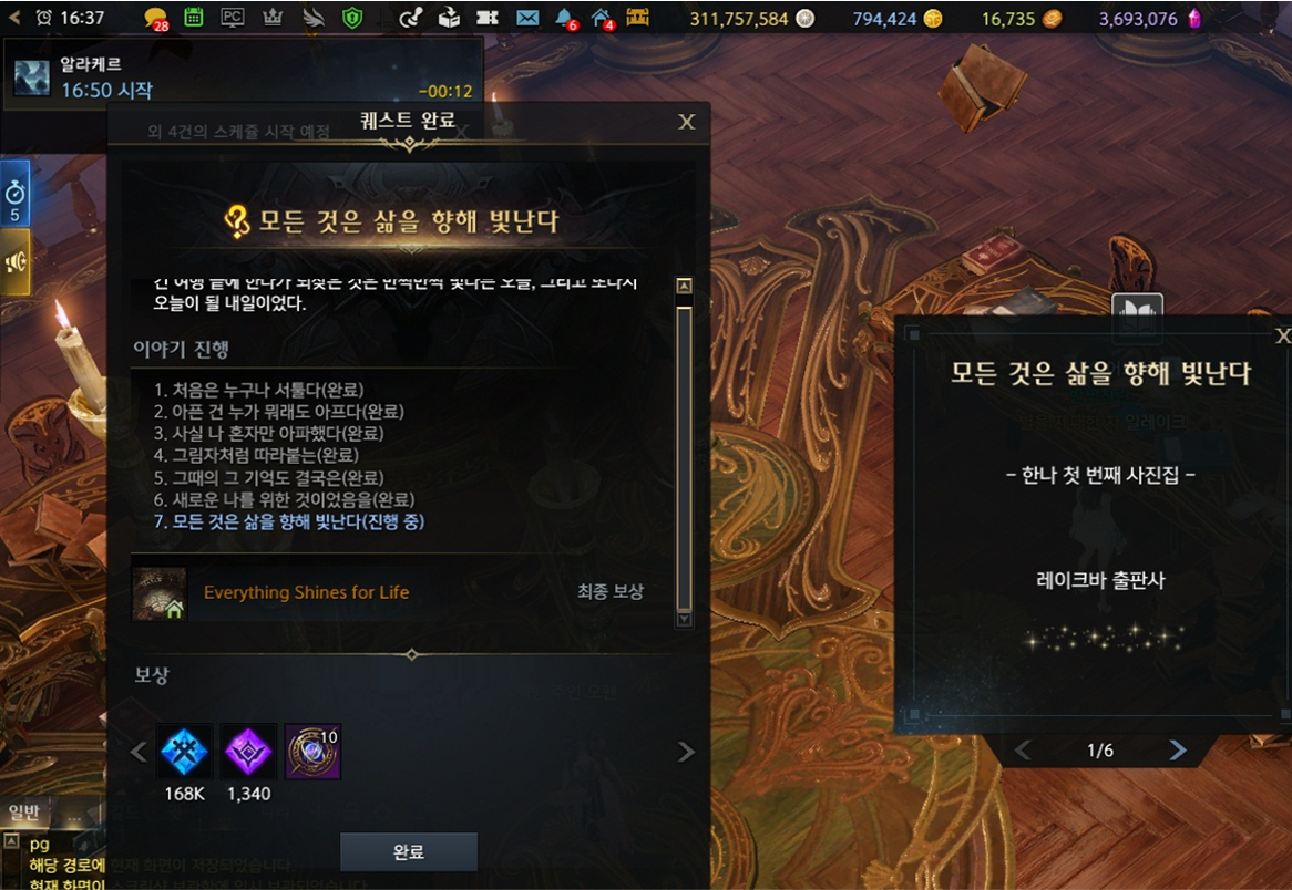 완료 가능 퀘스트인 모든 것은 삶을 향해 빛난다까지 클릭해 완료해줍니다.